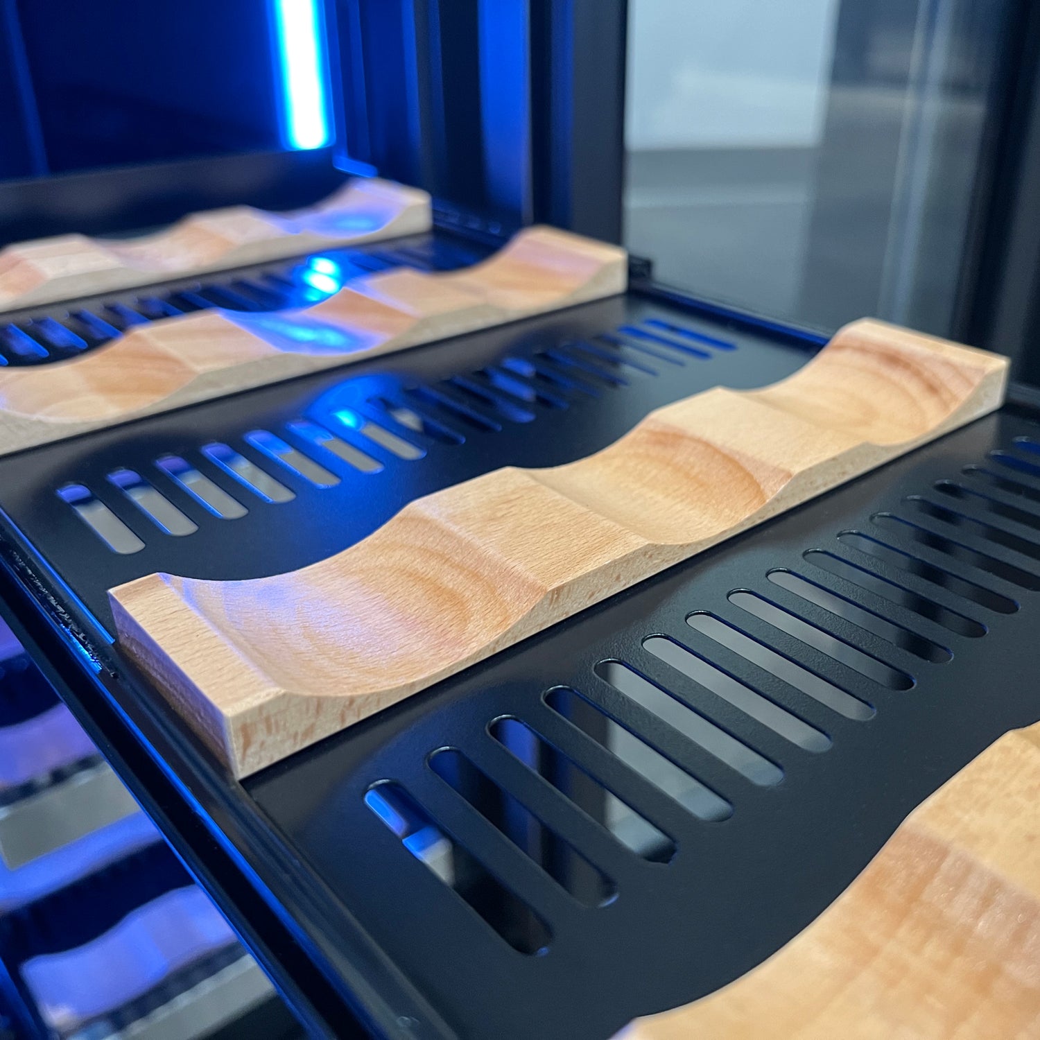 Allavino's trademarked FlexCount shelves provide the ultimate flexibility in storage options while maximizing capacity. The unique thin design allows more space between shelves for maximum storage, but also has a durable metal construction that resists sagging over time. Precision ball bearing tracks allow the shelves to smoothly glide outward for easy access to bottles.