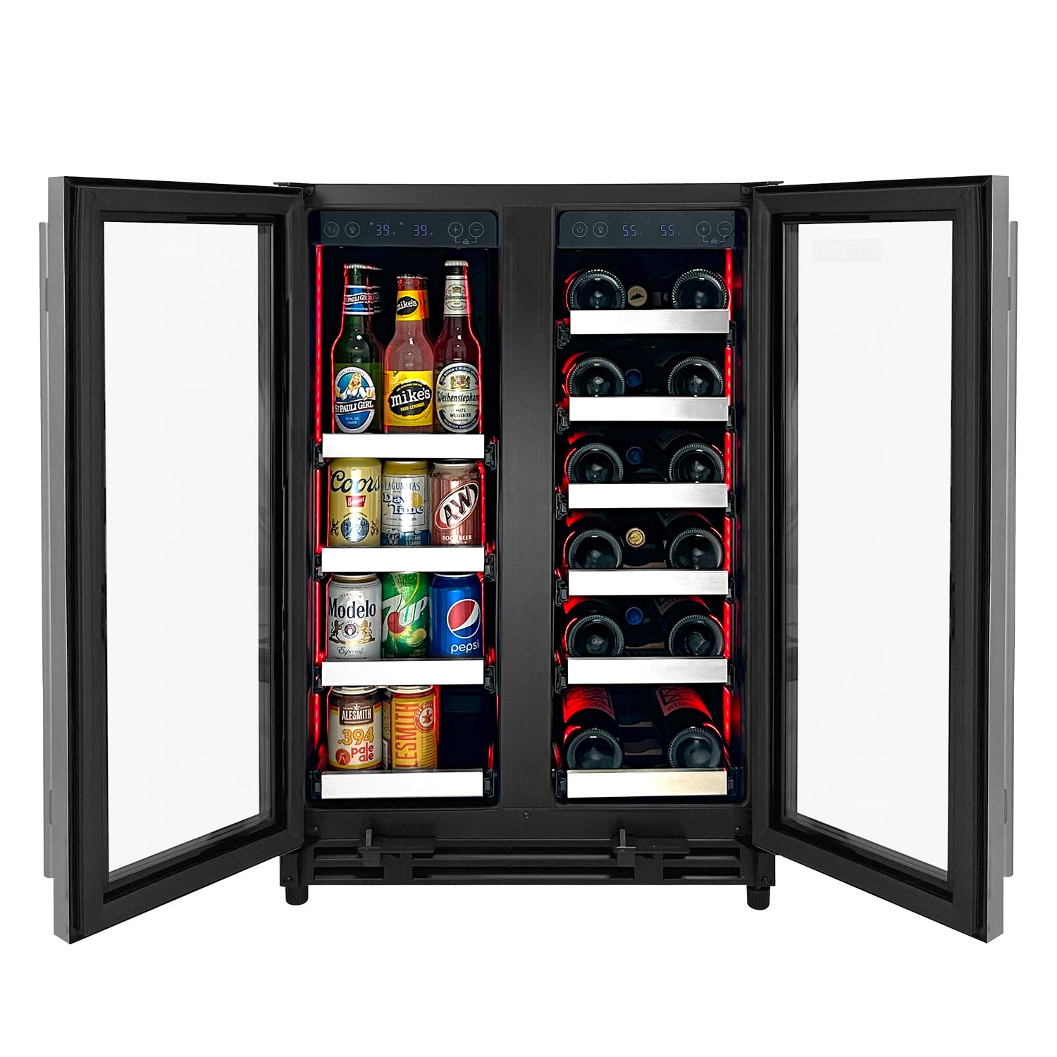 Allavino's Reserva Series 24" Wide VSBCW34FD-2S Wine Refrigerator/Beverage Center with Tru-Vino Temperature Control Technology features two separate, independently controlled storage zones that allow you to store your wine and other beverages at different temperatures. It gives you flexible storage options for up to 18 wine bottles, and up to 66 cans or 48 cans and 21 bottles.