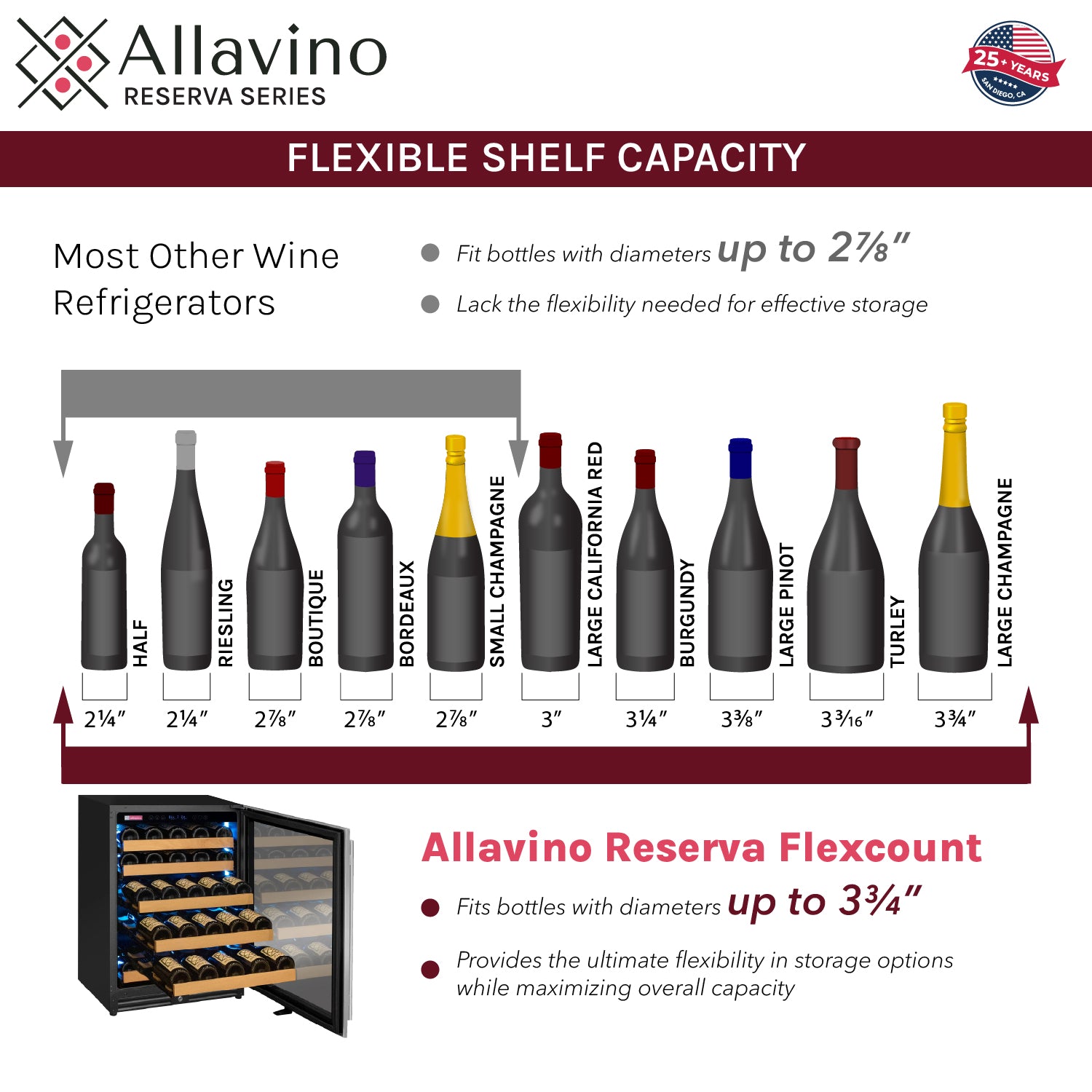 Allavino's exclusive FlexCount shelves give you ultimate flexibility and accessibility, regardless of bottle size. Spacing between each shelf gives you enough clearance to not worry about racks scraping your bottle labels. Wood slats refine each shelf to cradle your wine bottles and are designed with vibration-reduction technology to prevent harmful vibrations from excessive movement and damage.