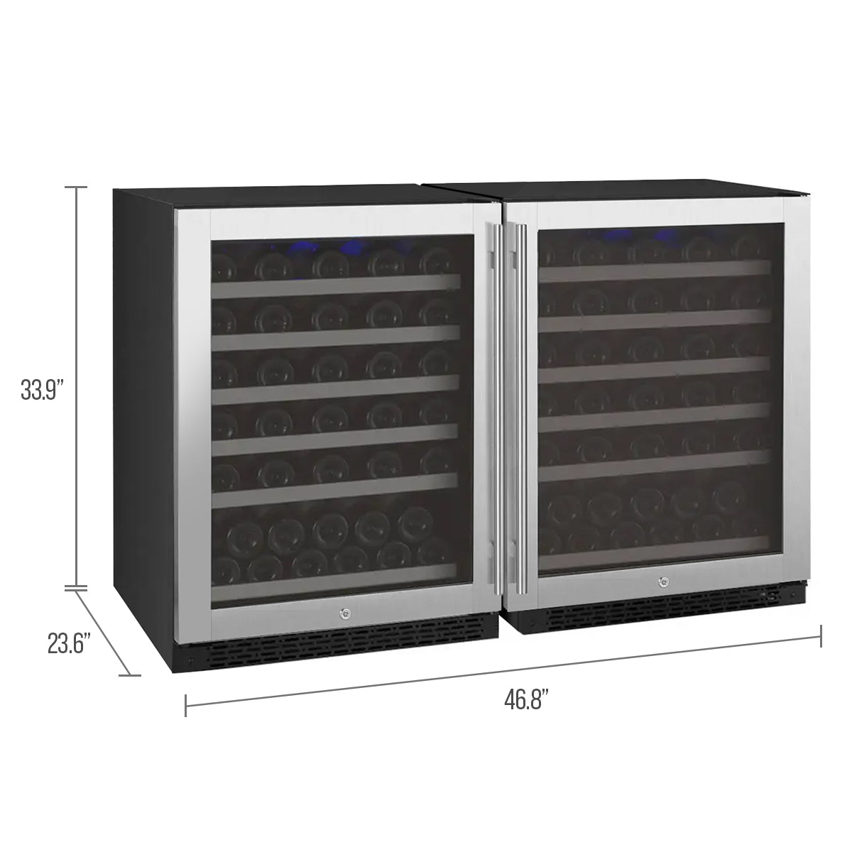The Allavino FlexCount II 2X-VSWR56-1S20 Dual Zone Wine Refrigerator with Tru-Vino Temperature Control Technology makes it easy to store up to 112 wine bottles of various sizes, and can be used as a stylish freestanding unit or built into your cabinetry for seamless wine storage. This unit is made up of two single zone wine refrigerators with opposite hinges placed side by side.