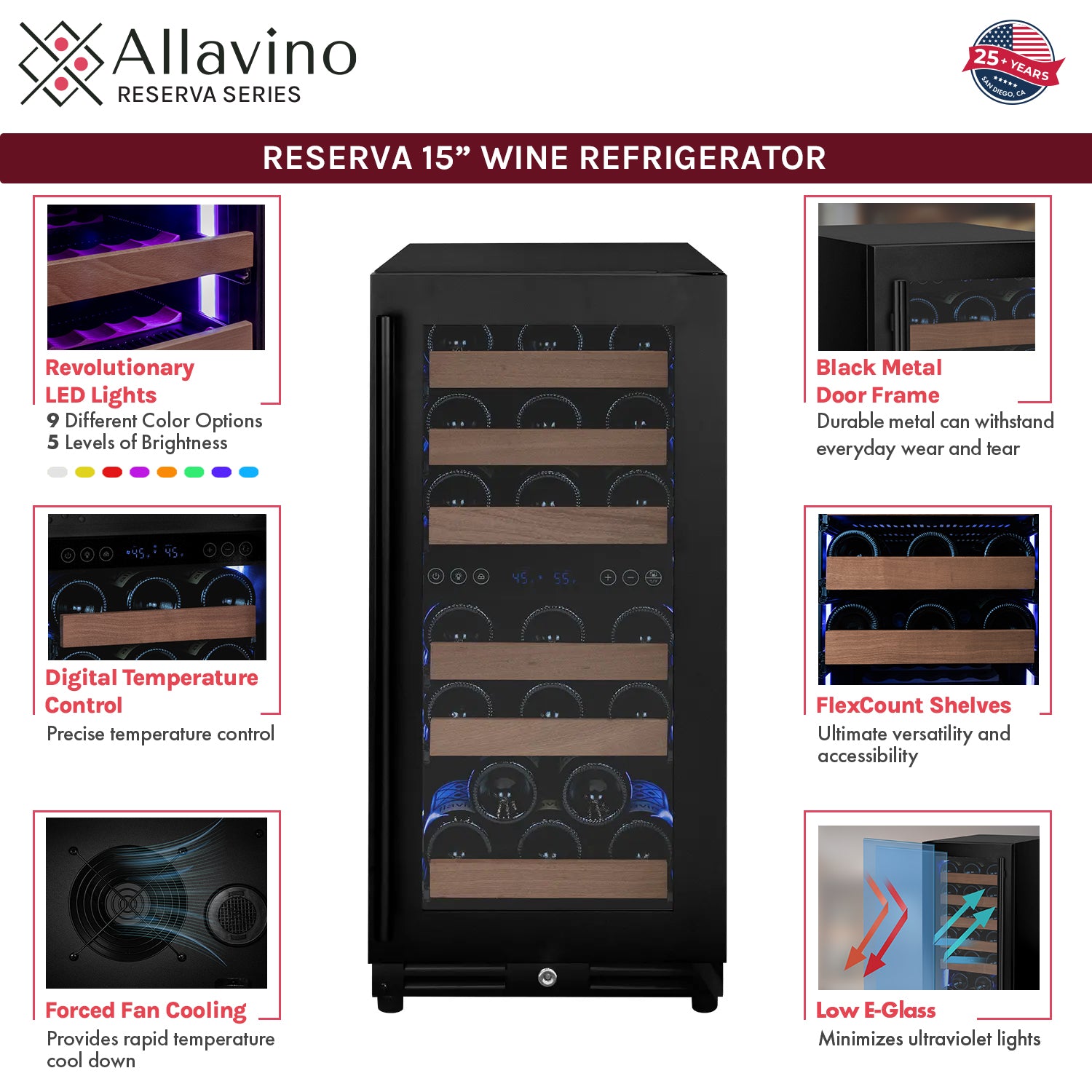Revolutionary Reserva LED lights give you 8 different color options + 1 full cycle option that rotates through all colors. Unlike incandescent lighting, LED lighting does not give off heat that can damage your wine. The LED light strips are flush with the wall interior allowing more storage space for your collection.
