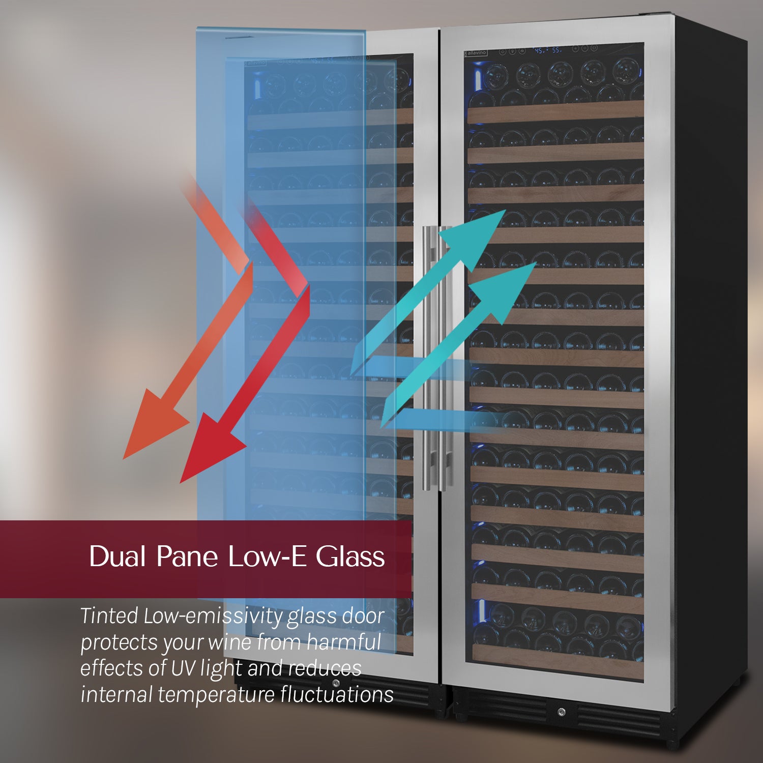 Allavino's 2X-VSW16371S-1S Reserva Series 326 Bottle 71" Tall Dual Zone Stainless Steel Side-by-Side Wine Refrigerator with Tru-Vino Temperature Control Technology is made up of two separate single zone wine refrigerators placed side by side. It gives you flexible storage options for up to 326 wine bottles.