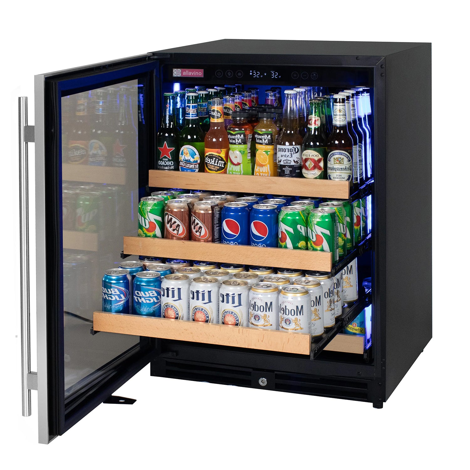 The beverage center has 4 shelves with a total storage capacity of 154 12oz cans, or 112 cans and 42 bottles. Spacing between each shelf gives you enough clearance to store any 12oz. can while maximizing storage capacity.