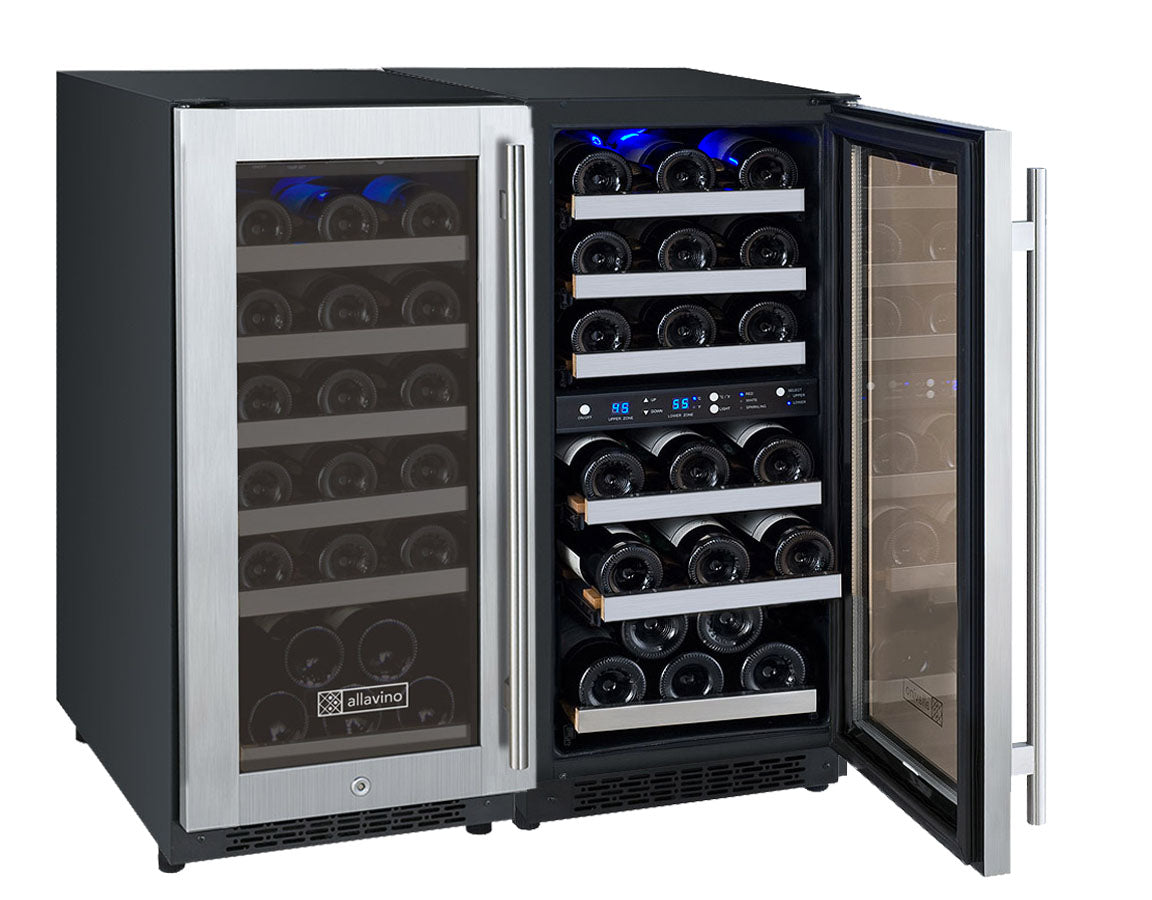 The Allavino FlexCount II 3Z-VSWR30-S20 Three Zone Wine Refrigerator with Tru-Vino Temperature Control Technology makes it easy to store up to 60 wine bottles of various sizes, and can be used as a stylish freestanding unit or built into your cabinetry for seamless wine storage. This unit is made up of one single zone and one dual zone wine refrigerator with opposite hinges placed side by side.