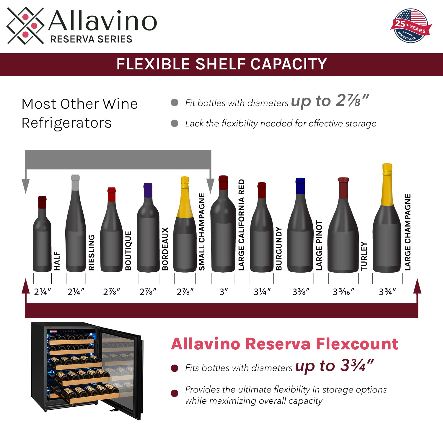 Allavino's exclusive FlexCount shelves give you ultimate flexibility and accessibility, regardless of bottle size. Spacing between each shelf gives you enough clearance to not worry about racks scraping your bottle labels. Wood slats refine each shelf to cradle your wine bottles and are designed with vibration-reduction technology to prevent harmful vibrations from excessive movement and damage.