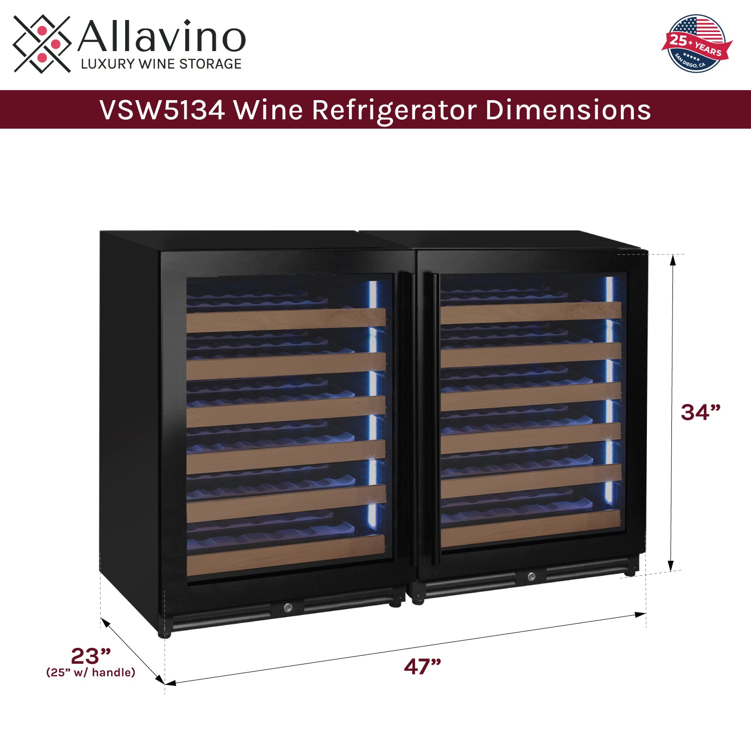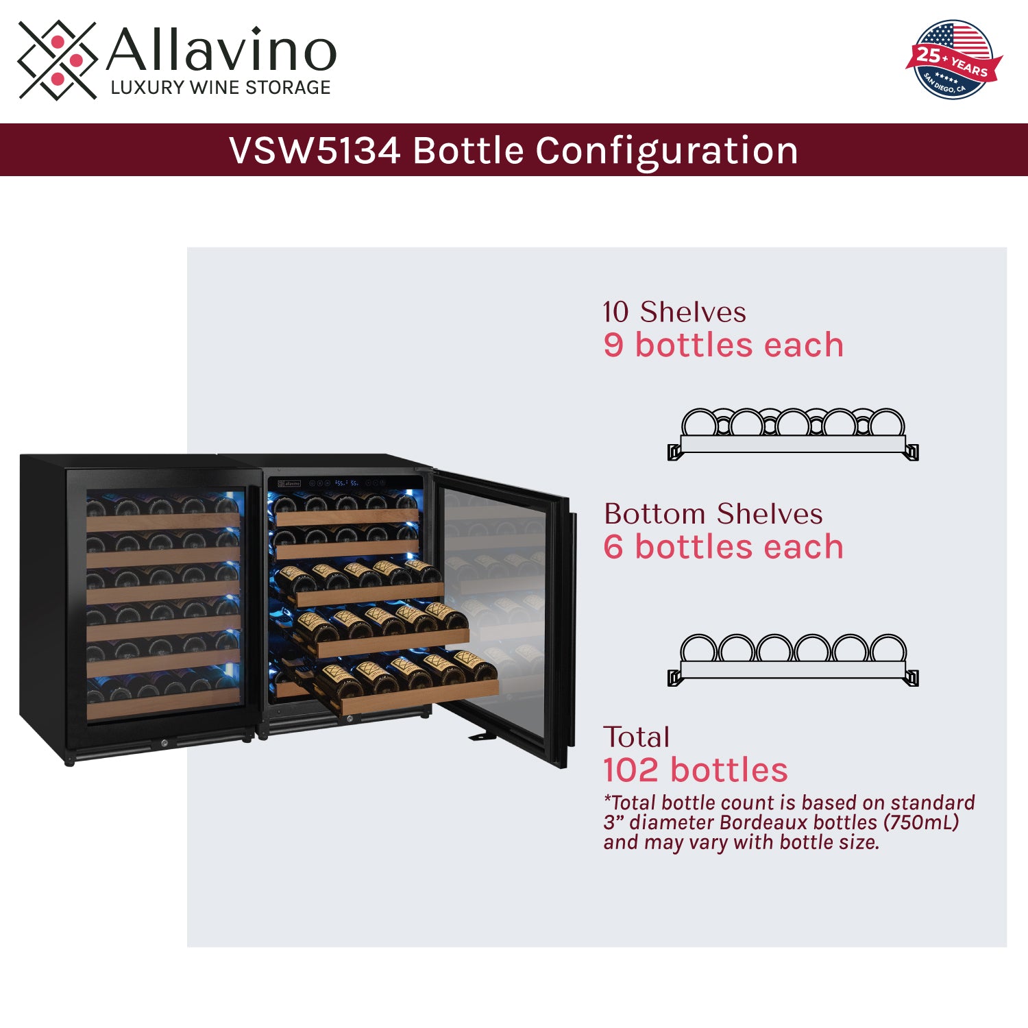 Allavino's exclusive FlexCount shelves give you ultimate flexibility and accessibility, regardless of bottle size. Spacing between each shelf gives you enough clearance to not worry about racks scraping your bottle labels. Wood slats refine each shelf to cradle your wine bottles and are designed with vibration-reduction technology to prevent harmful vibrations from excessive movement and damage.