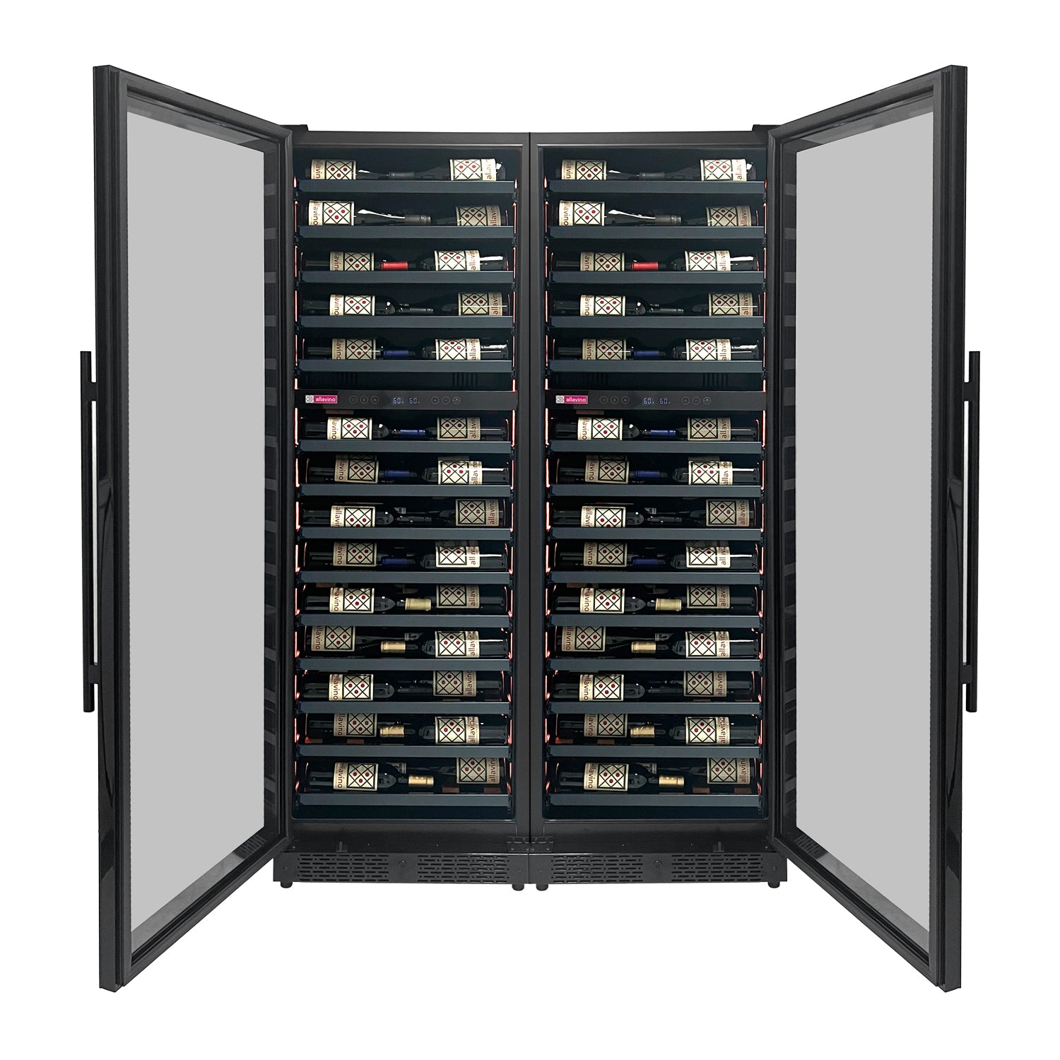 Allavino's 2X-VSW6771D-2B Reserva Series 71" Tall Four Zone Black Side-by-Side Shallow Wine Refrigerator Console with Tru-Vino Temperature Control Technology is made up of two separate dual zone wine refrigerators placed side by side. It gives you flexible storage options for a diverse collection of up to 134 wine bottles.