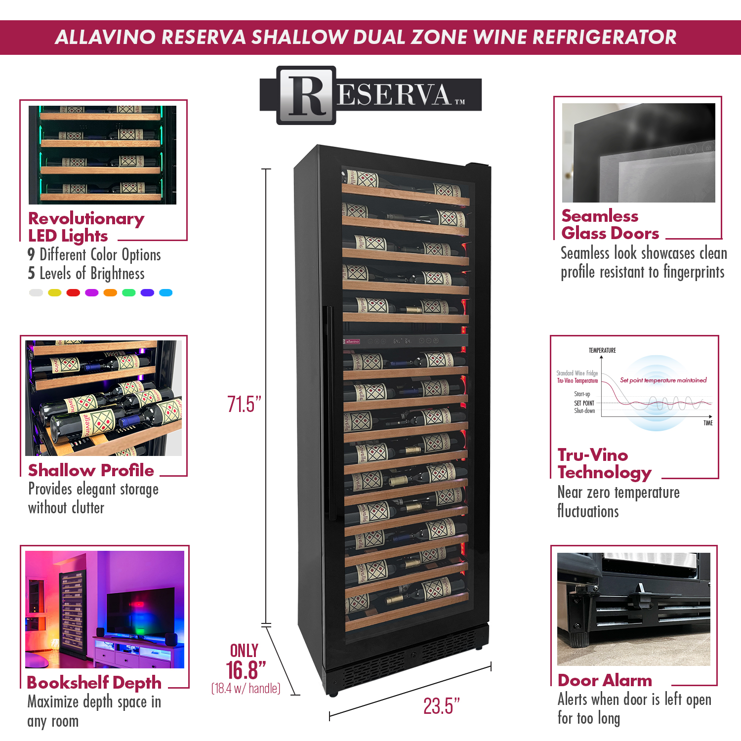 The VSW6771D-2BR-WD can store up to 67 standard bottles with elegant style. An attractive black door frame holds specially coated glass which blocks damaging UV rays. Lighting controls allow you to change the color of the lighting inside to one of 9 colors, or a cycle of all if you desire. Store any type of wine at their preferred temperatures with the pair of separate temperature zones inside. Tru-Vino technology inside hold the temperature steady at your chosen thermostat setting.