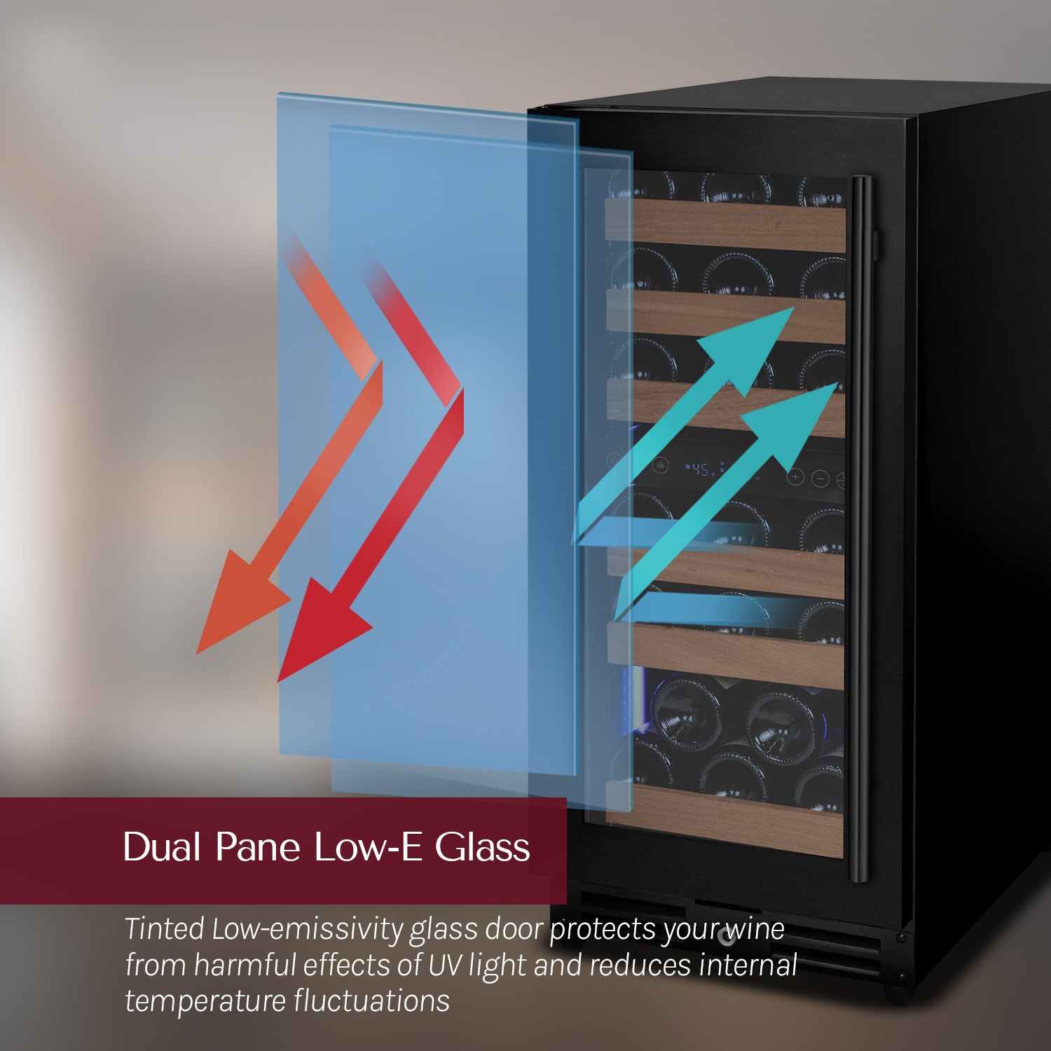 The tinted low-emissivity glass door protects your wine from the harmful effects of UV light. The low-e coating also reduces internal temperature fluctuations allowing better insulation.