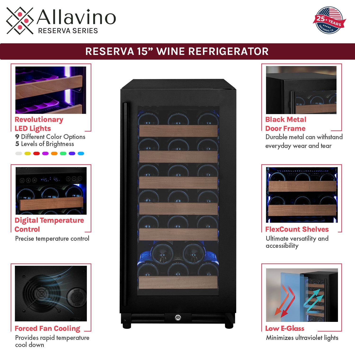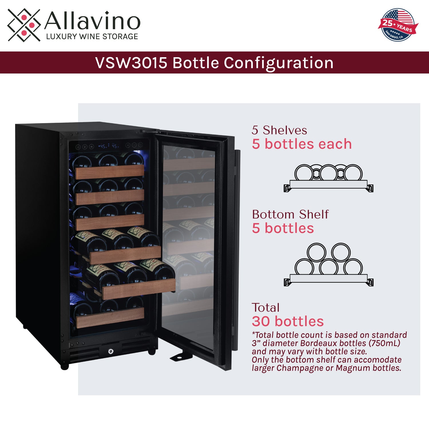 Allavino's exclusive FlexCount shelves give you ultimate flexibility and accessibility. Spacing between each shelf gives you enough clearance to not worry about racks scraping your bottle labels. Wood slats refine each shelf to cradle your wine bottles and are designed with vibration-reduction technology to prevent harmful vibrations from excessive movement and damage.