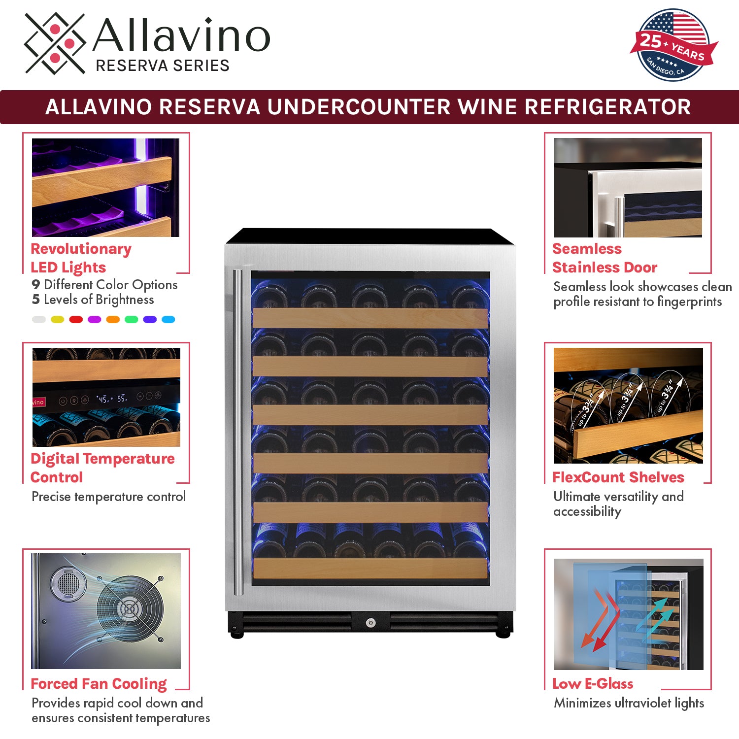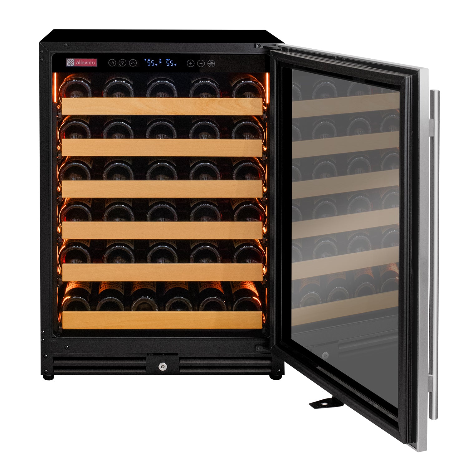 Allavino's exclusive FlexCount shelves give you ultimate flexibility and accessibility, regardless of bottle size. Spacing between each shelf gives you enough clearance to not worry about racks scraping your bottle labels. Wood slats refine each shelf to cradle your wine bottles and are designed with vibration-reduction technology to prevent harmful vibrations from excessive movement and damage.