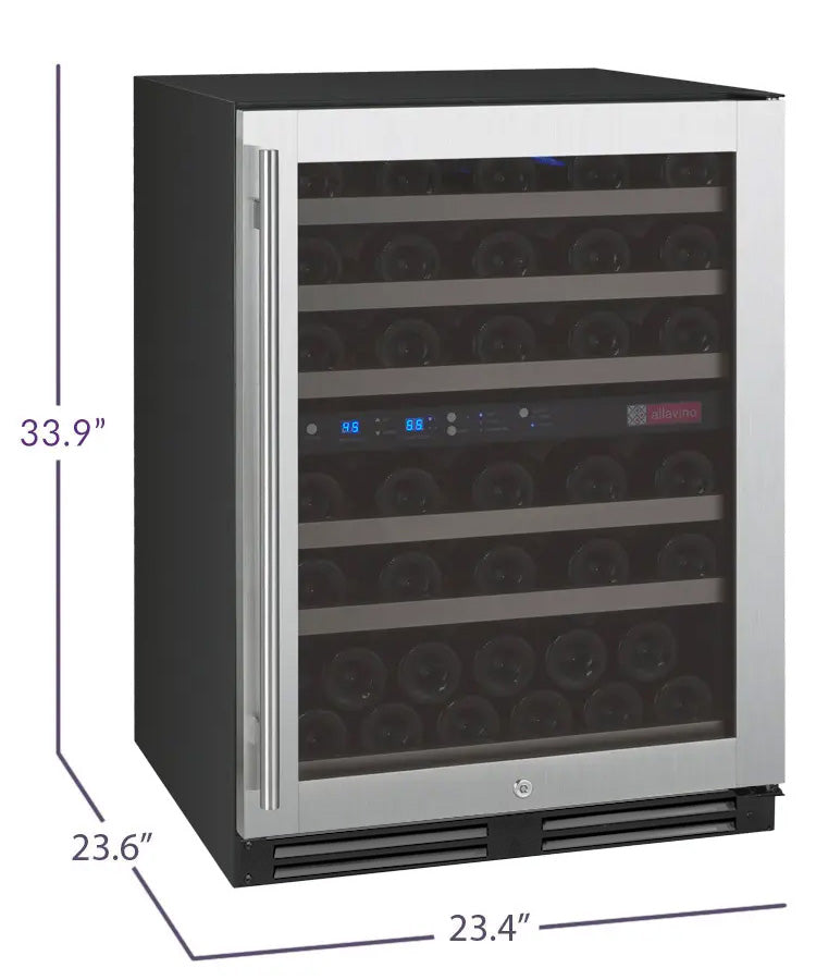 The Allavino FlexCount II Series VSWR56-2SR20 Dual Zone Wine Refrigerator with Tru-Vino Temperature Control Technology makes it easy to store up to 56 wine bottles of various sizes, and can be used as a stylish freestanding unit or built into your cabinetry for seamless wine storage.