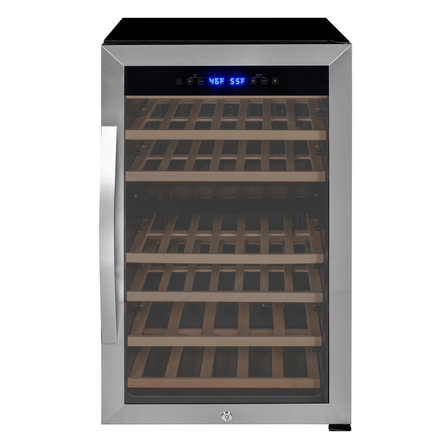 A digital control panel with physical buttons allows you to precisely set the temperature in each zone independently, between 41-54 degrees Fahrenheit (5-12°C) in the upper zone and between 54-68 (12-20°C) in the lower zone. The compressor cooler can handle higher ambient temps and is able to get colder, down to 41° (54° for the lower zone). Independent temperature zone management is a useful feature that allows you to keep different wines at their ideal temperatures within the same fridge.