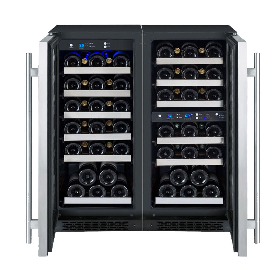 The Allavino FlexCount II 3Z-VSWR30-S20 Three Zone Wine Refrigerator with Tru-Vino Temperature Control Technology makes it easy to store up to 60 wine bottles of various sizes, and can be used as a stylish freestanding unit or built into your cabinetry for seamless wine storage. This unit is made up of one single zone and one dual zone wine refrigerator with opposite hinges placed side by side.