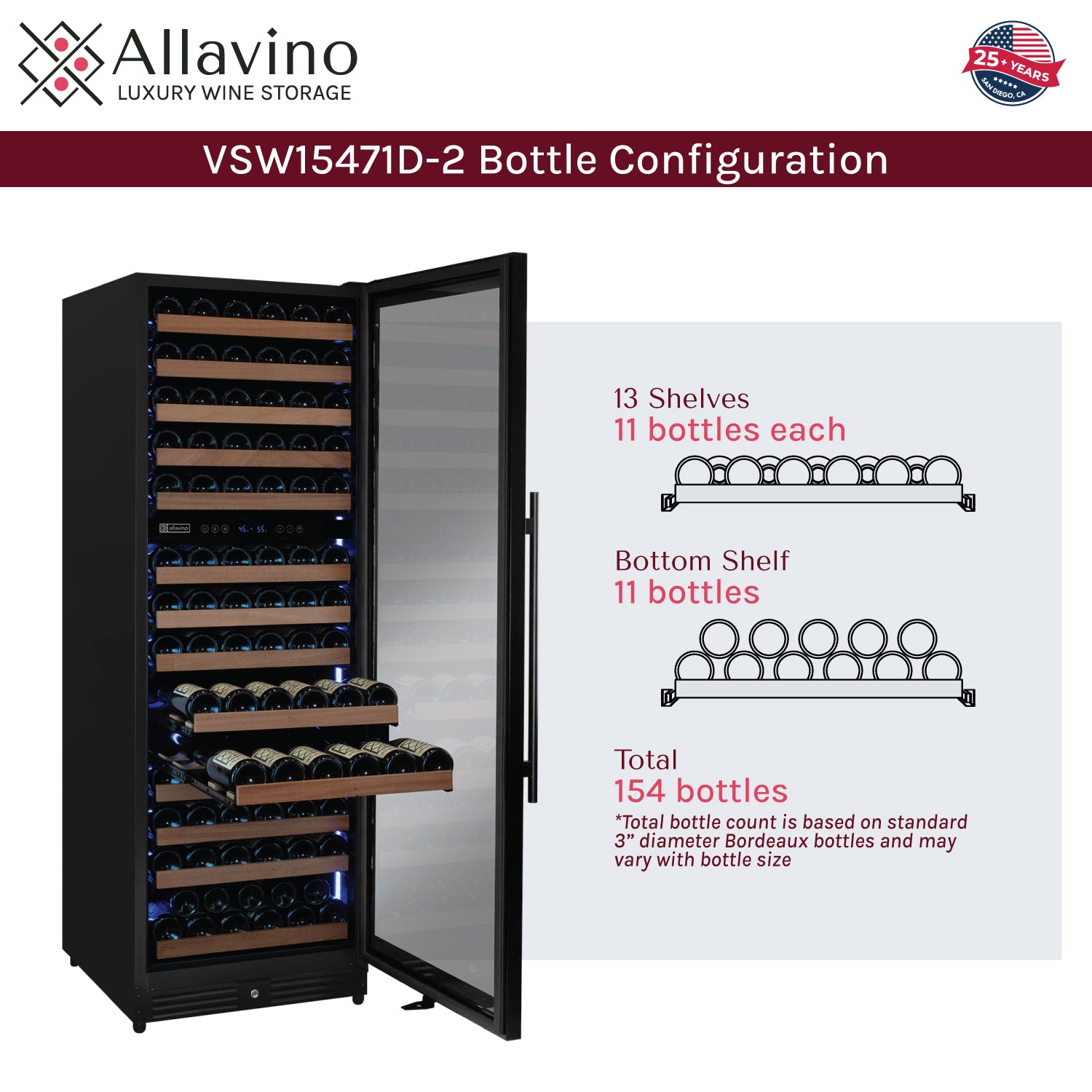 Allavino's exclusive FlexCount shelves give you ultimate flexibility and accessibility, regardless of bottle size. Spacing between each shelf gives you enough clearance to not worry about racks scraping your bottle labels. Wood slats refine each shelf to cradle your wine bottles and are designed with vibration-reduction technology to prevent harmful vibrations from excessive movement and damage.
