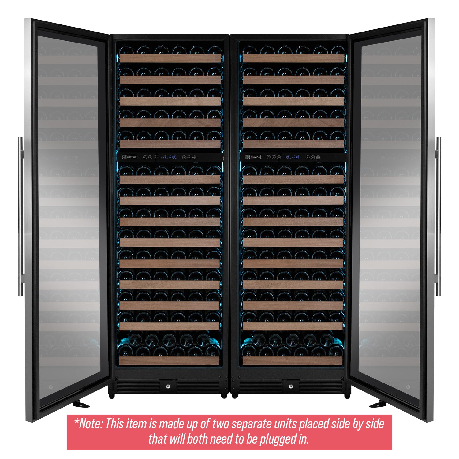 Allavino's 2X-VSW15471D-2S Reserva Series 308 Bottle 71" Tall Four Zone Stainless Steel Side-by-Side Wine Refrigerator with Tru-Vino Temperature Control Technology is made up of two separate dual zone wine refrigerators placed side by side. The wine storage racks feature wood slats that cradle your bottles for added protection. The seamless stainless steel doors showcase an elegant and clean profile while also resisting visible fingerprints, and the tinted LowE glass protects your wine from the harmful effects of UV light. The customizable LED lighting allows you to choose from 9 color options and 5 brightness levels. Unlike incandescent lighting, LED lighting does not give off heat that can damage your wine. Two digital control panels allow you to precisely set the temperature in each zone independently, between 41-64 degrees Fahrenheit. Energy efficient Tru-Vino Cooling Technology delivers precise temperature control with low vibrations and ultra-quiet operation. Allavino's trademarked FlexCount shelving design provides the ultimate flexibility in storage options while maximizing capacity. It gives you flexible storage options for a diverse collection of up to 308 wine bottles.