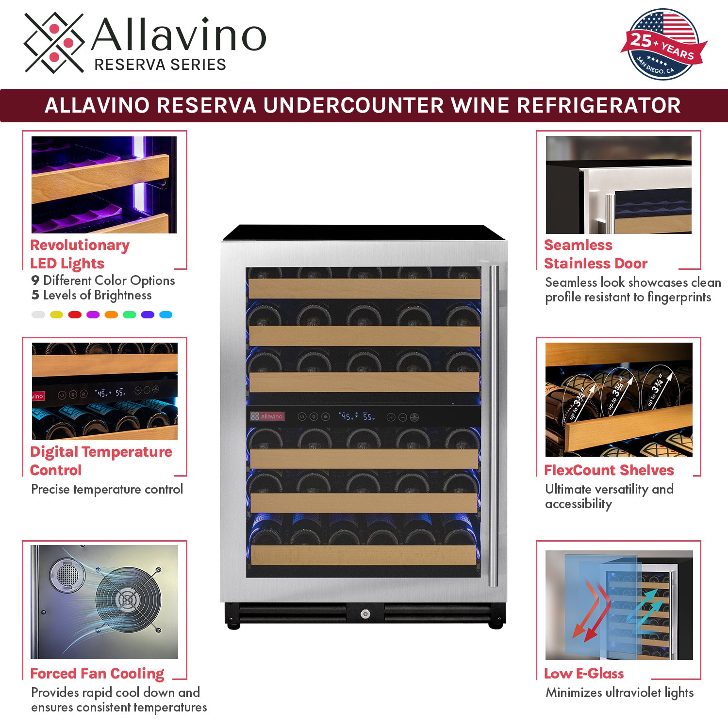 Allavino's exclusive FlexCount shelves give you ultimate flexibility and accessibility, regardless of bottle size. Spacing between each shelf gives you enough clearance to not worry about racks scraping your bottle labels. Wood slats refine each shelf to cradle your wine bottles and are designed with vibration-reduction technology to prevent harmful vibrations from excessive movement and damage.