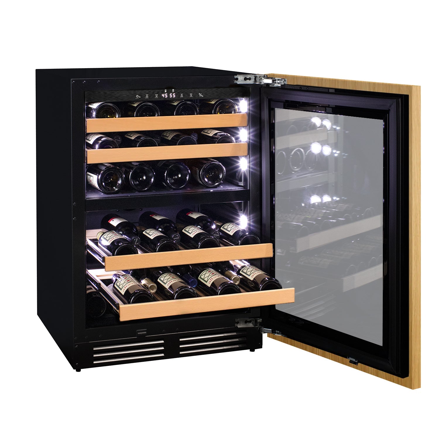 The Allavino VCWR-24PRD-2R Dual Zone Panel Ready Wine Refrigerator stores up to 43 wine bottles of various sizes, and can be customized and built-in to match your cabinetry for seamless wine storage. Protect and preserve your wine collection with the latest innovation in wine storage technology by Allavino. Precisely set your desired temperature with the easy-to-use digital control panel. Allavino's wine racking technology is designed to hold your bottles with vibration-reduction technology to protect aging wines. This unique shelving design allows for ultimate flexibility and versatility when it comes to storing a variety of bottle sizes and shapes. Easy gliding shelves allow for 90% easy access to your collection without disrupting the delicate wine maturation process.