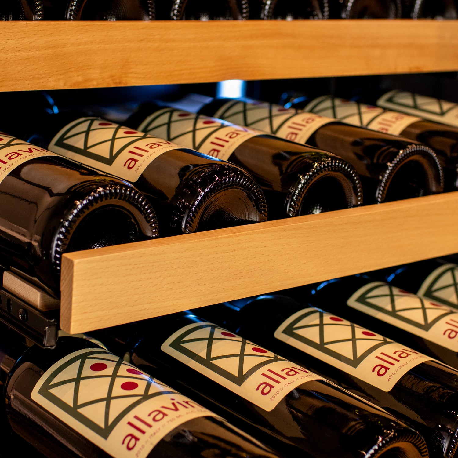 Allavino’s exclusive FlexCount wine racking technology incorporates revolutionary metal shelves that are strong enough to hold bottles without sagging, yet thin enough to maximize the available storage space. Wood slats refine each shelf and gently cradle each bottle to prevent harmful vibrations from affecting your wine. Each shelf glides out smoothly on ball bearing tracks, allowing easy access to your collection without disrupting the delicate wine maturation process.